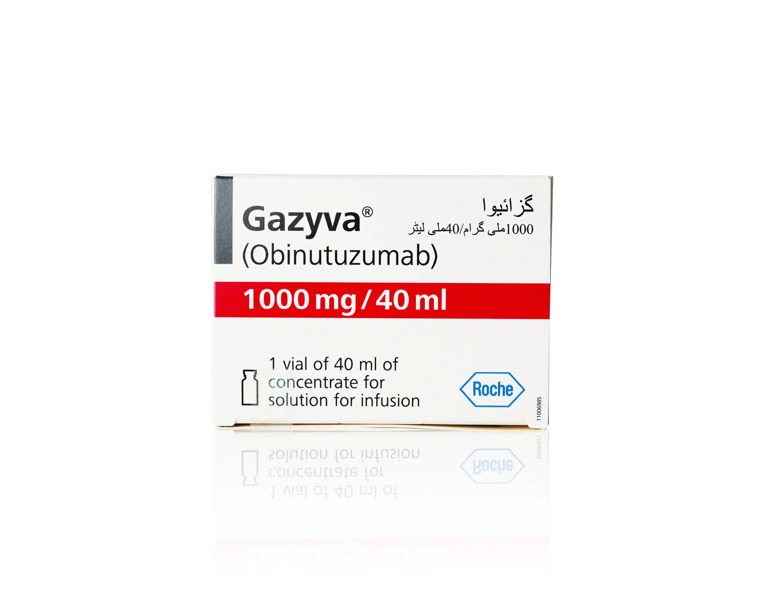 Gazyva contains Obinutuzumab, a humanized type II anti-CD20 monoclonal antibody of the IgG1 subclass. It is produced by mammalian cell (CHO) suspension culture and glycoengineered with reduced fucose content in its Fc region — a structural modification that significantly enhances immune effector cell activation compared to first-generation anti-CD20 antibodies such as rituximab. Each 40 mL vial is formulated in L-histidine, L-histidine hydrochloride monohydrate, trehalose dihydrate, and poloxamer 188 at pH 6.0.